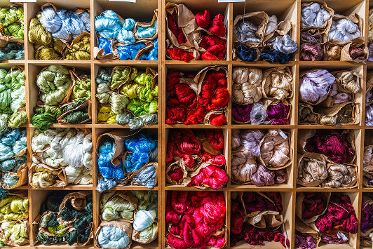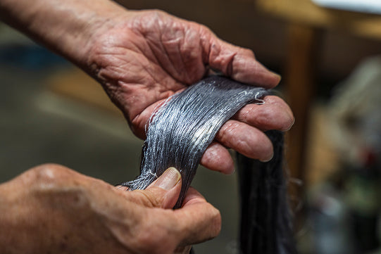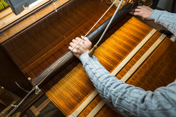 西陣織の生地が一反仕上がるまでに、20以上の工程を経て、延べ40人近くの職人が関わることも。図案を描く人、糸を染める人、織機を調整する人、織る人...全工程が分業制で、ひとつの工程でも狂えば、仕上がりに影響が及ぶほど緻密です。とくに手織りでは、文様の細かさによっては1日に織れる長さがわずか数センチ、完成までに1〜2ヶ月かかることもあります。私たちが「一枚の布」として手に取るその奥には、分担され、連携された技術の積み重ねが息づいています。