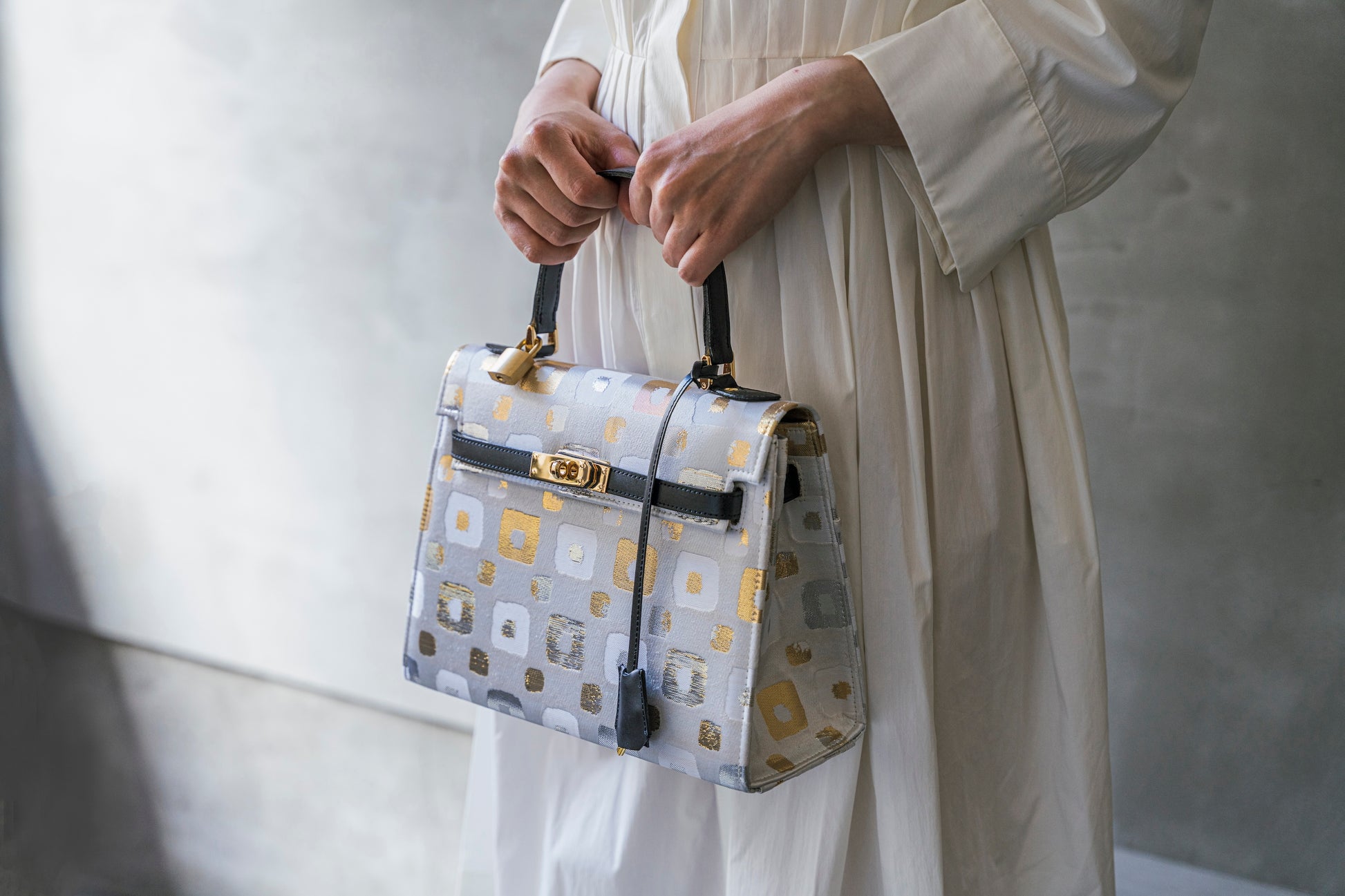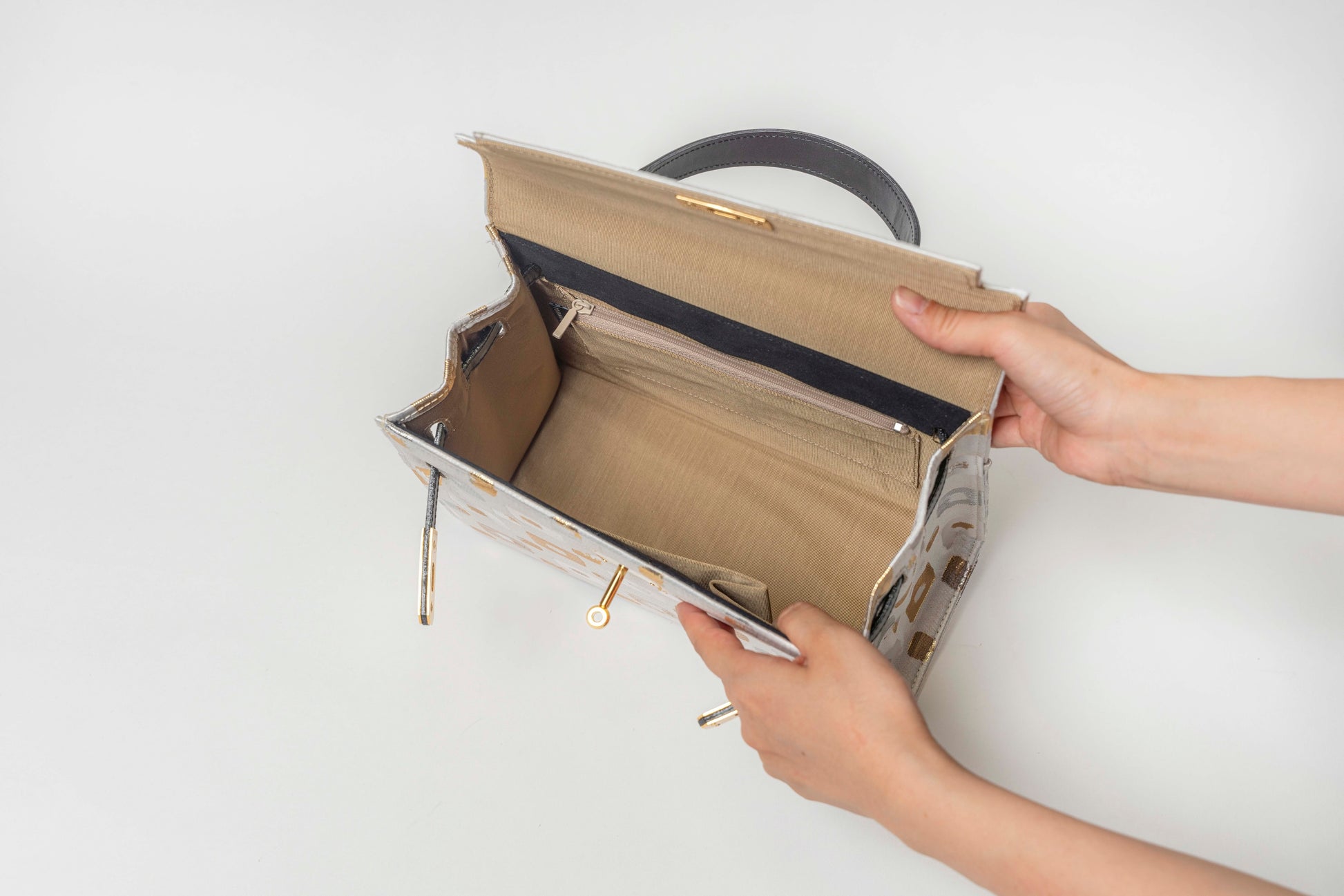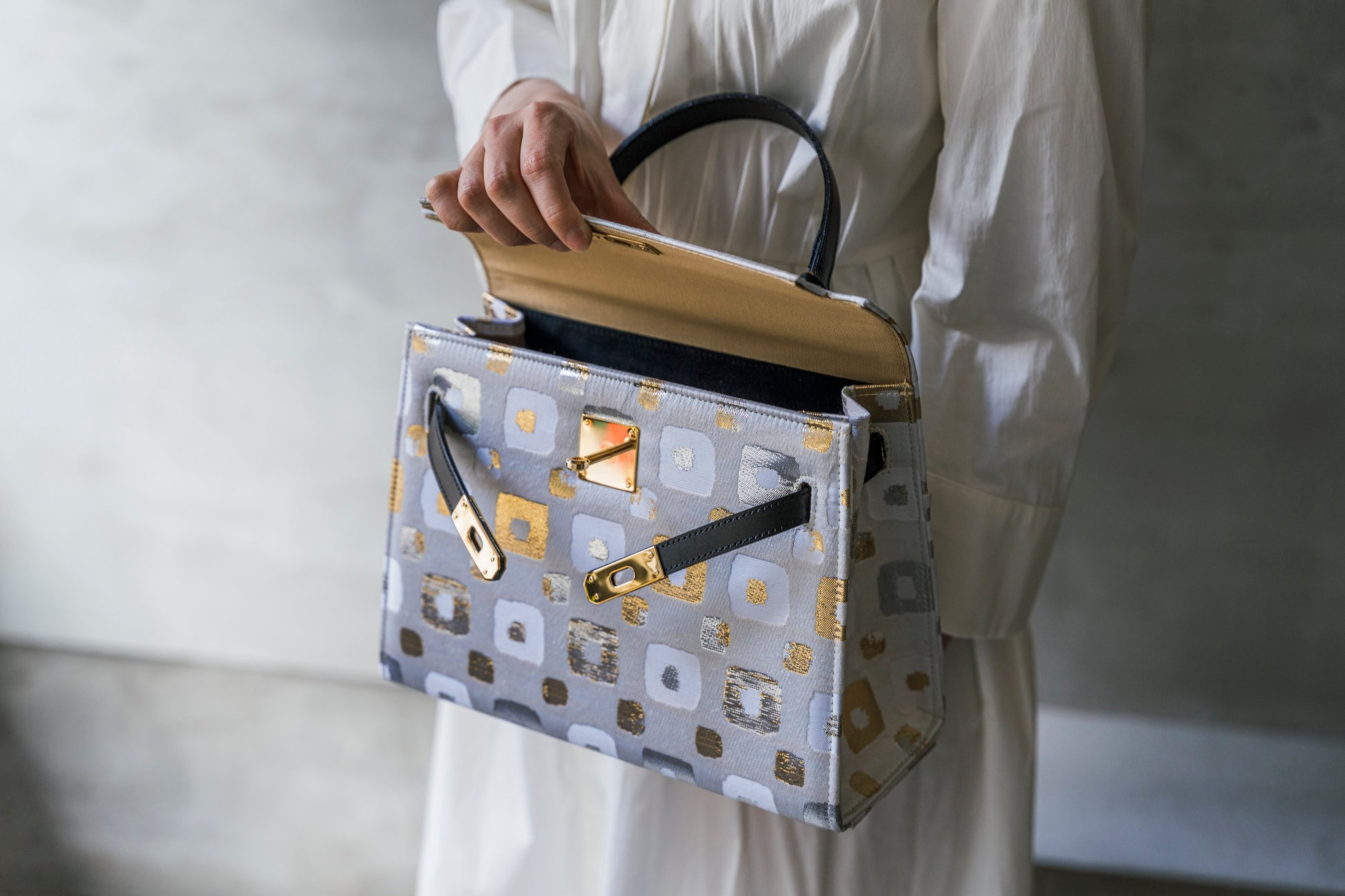 西陣織の光の角度で表情を変える美しい輝きと、重厚感が美しいバッグです。