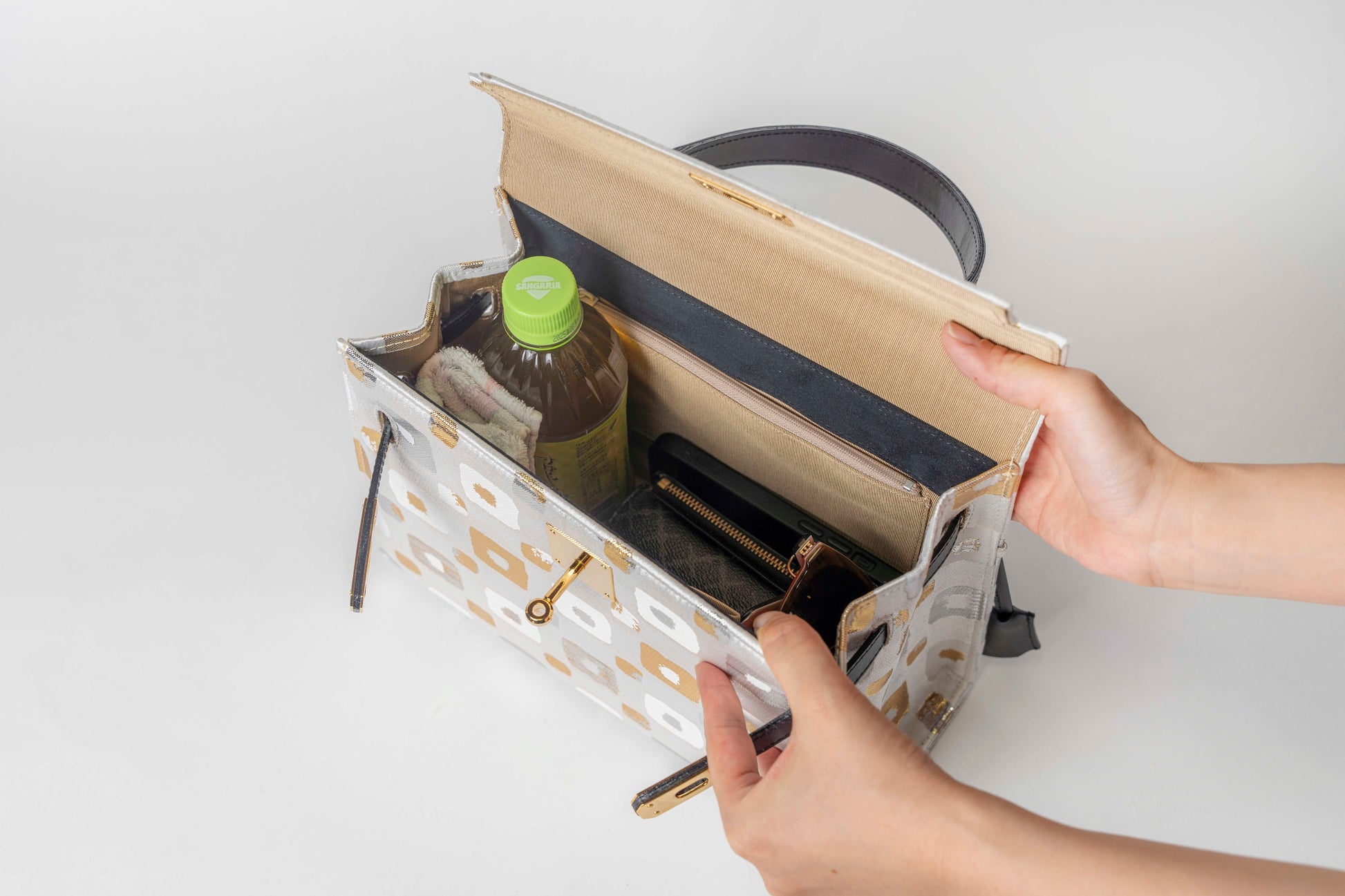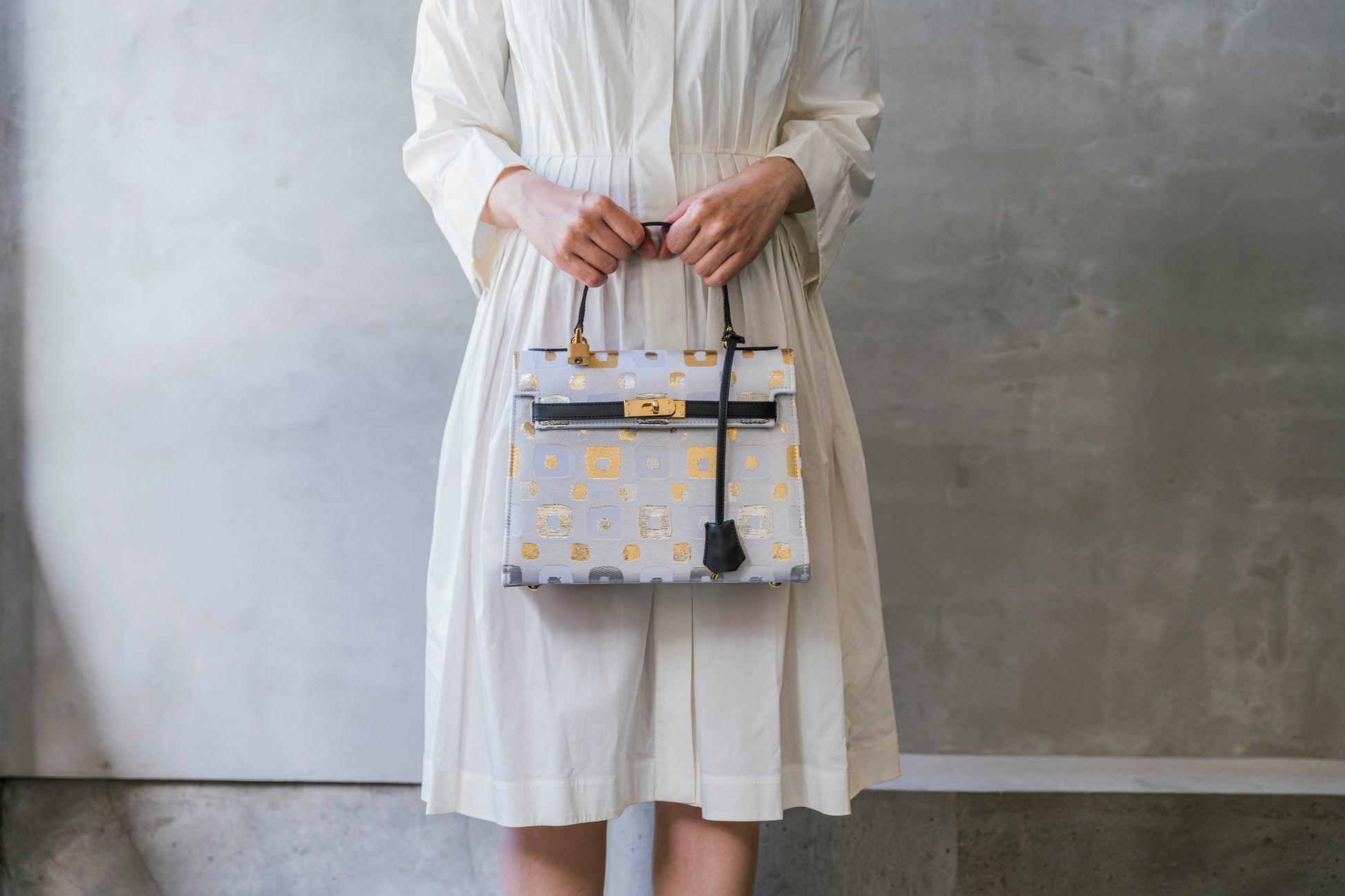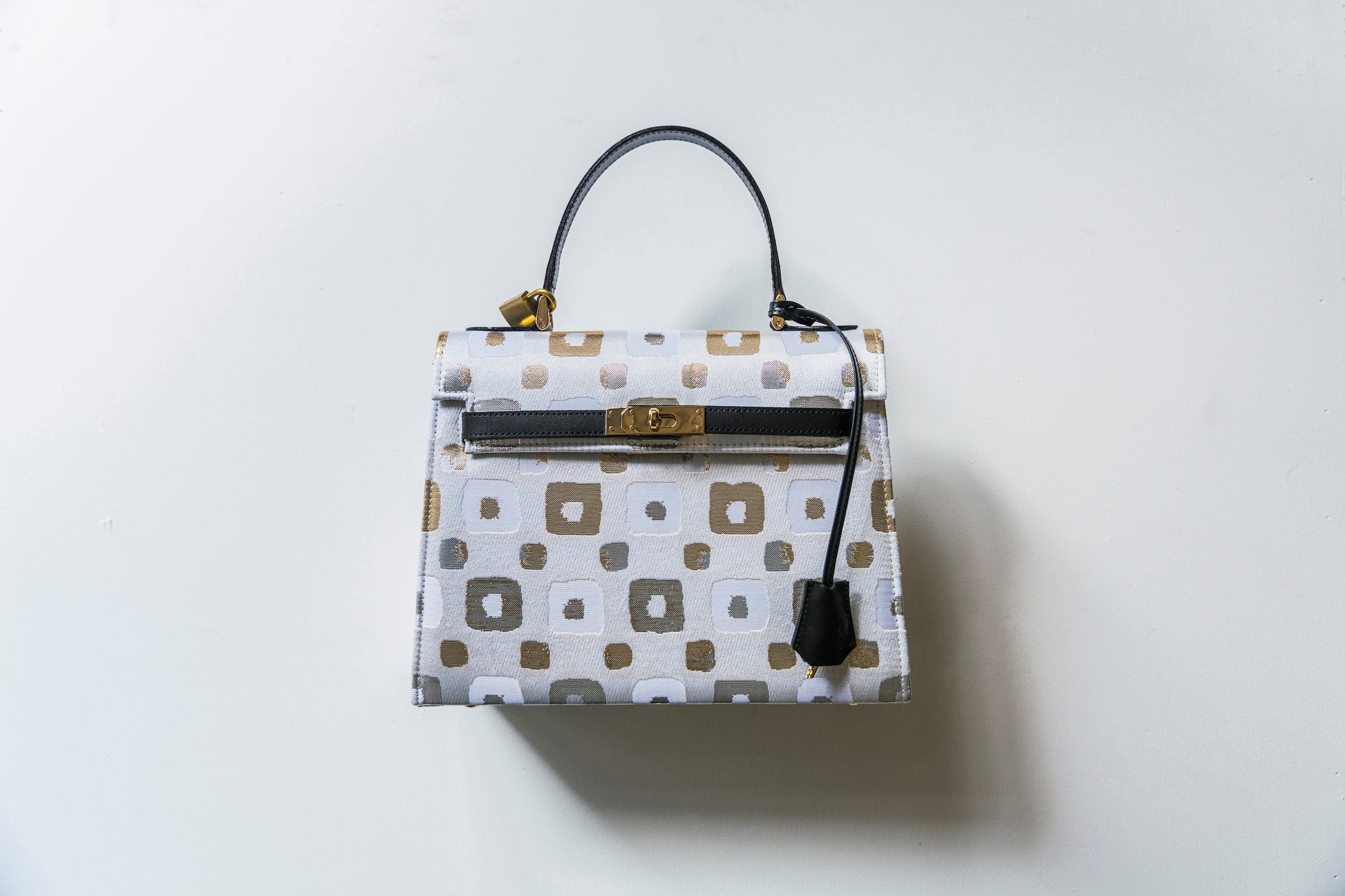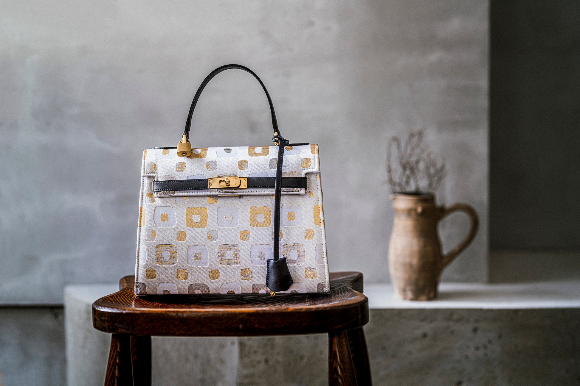 西陣織の光の角度で表情を変える美しい輝きと、重厚感が美しいバッグです。
